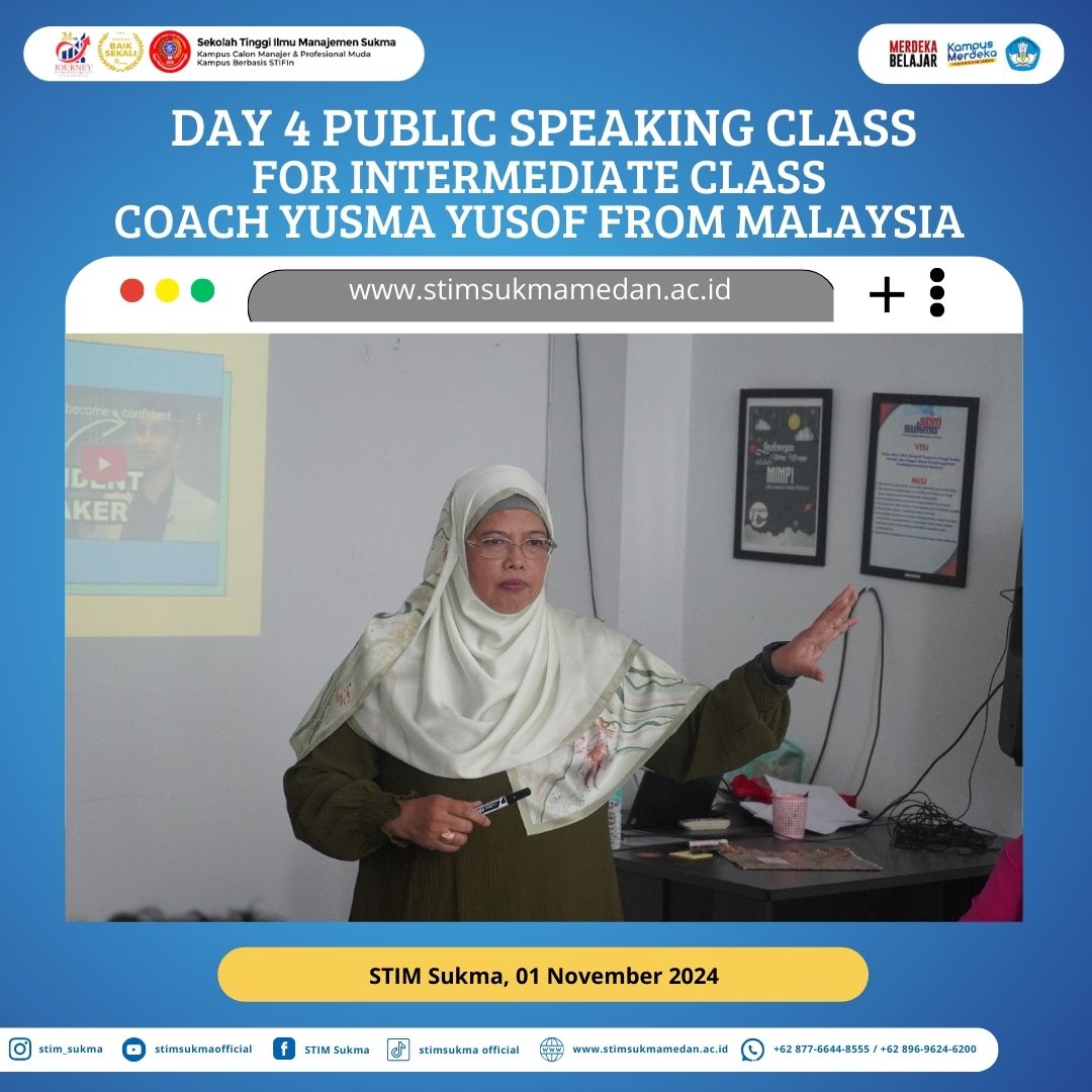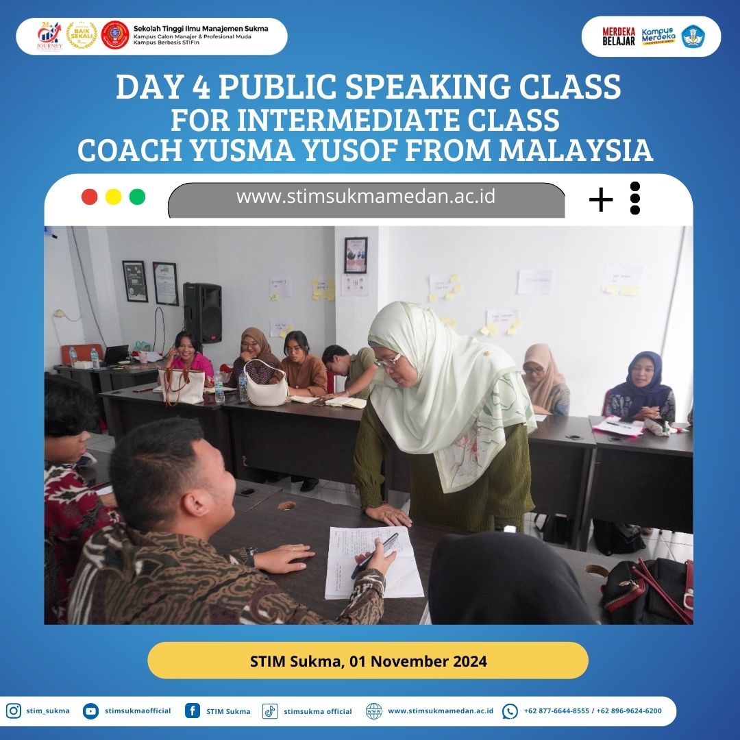 “✨ Day 4 kelas Public Speaking untuk Intermediate class masih bersama Coach Yusma Yusof dari Malaysia di STIM Sukma berjalan seru! 🎉