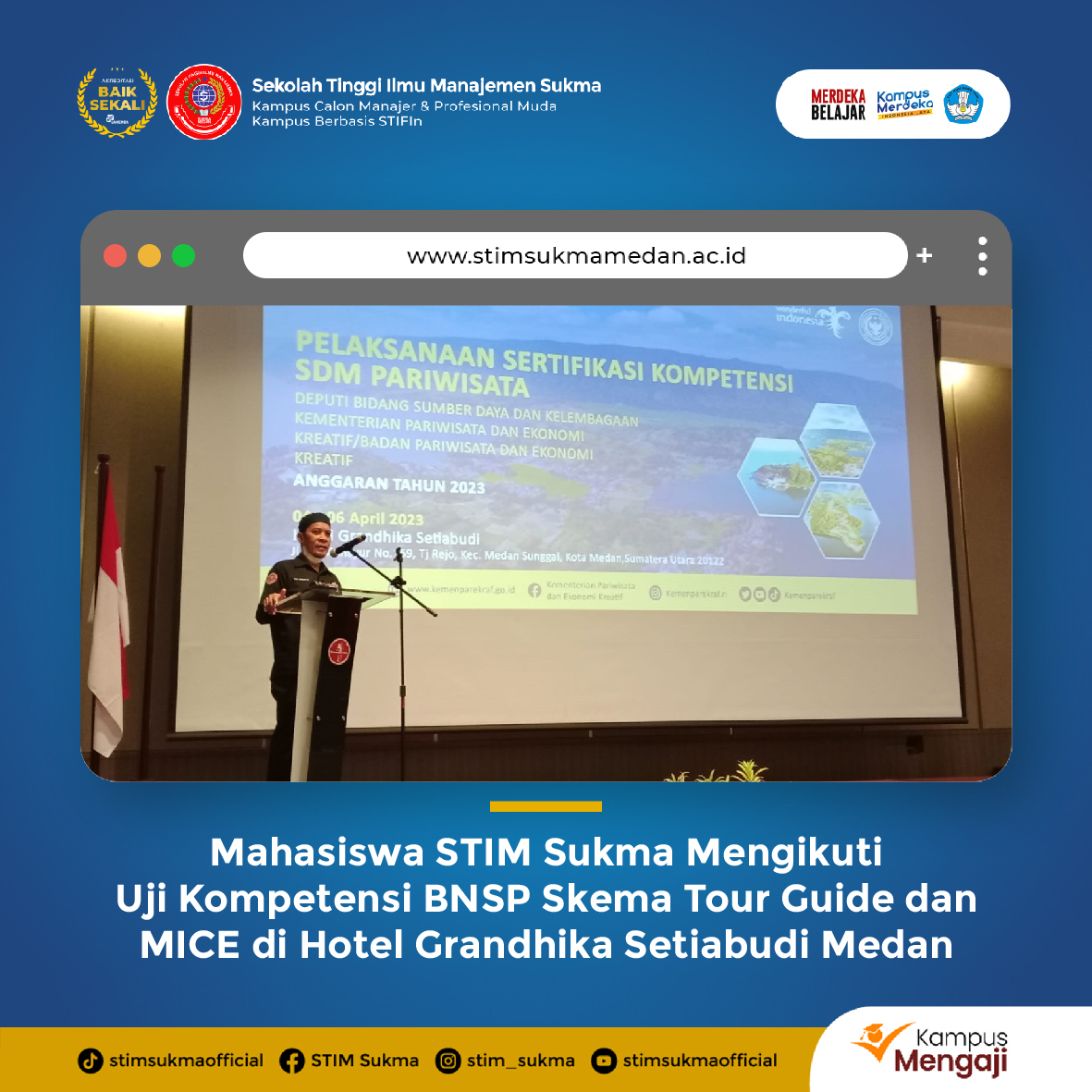Wakil Ketua STIM Sukma, Edi Winata, S.E, M.M, didampingi Yan Djuna, Staf Ahli Non Akademik hadir di acara pembukaan Pelaksanaan Sertifikasi Kompetensi SDM Pariwisata yang diselenggarakan oleh Kementerian Pariwisata dan Ekonomi Kreatif melalui LSP Diyafa Kencana Indonesia di Hotel Grandhika Medan pada Selasa (04/4/2023).