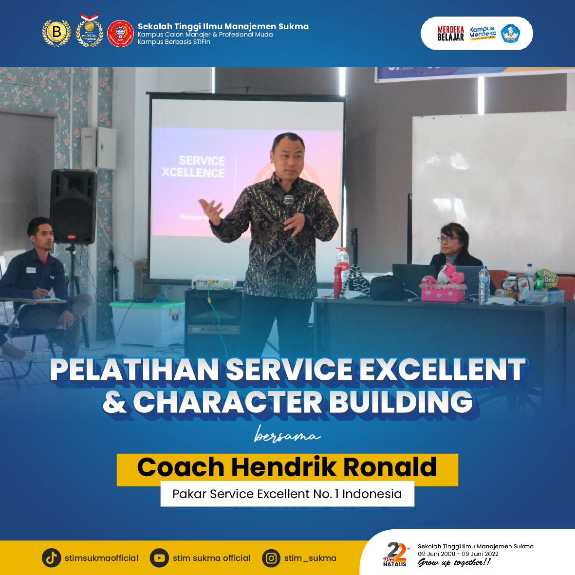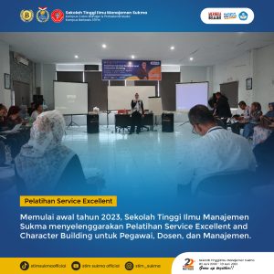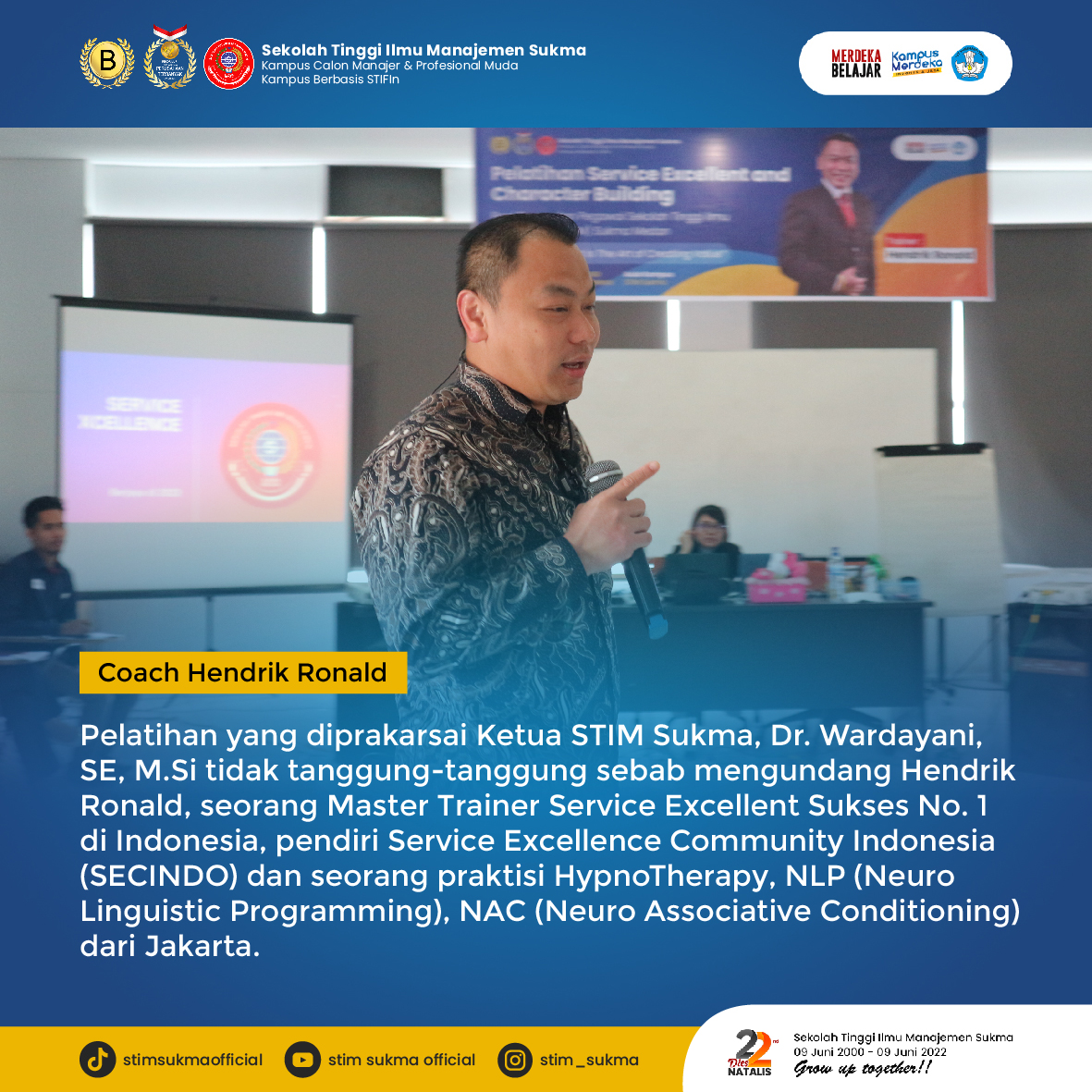 Memulai awal tahun 2023, Sekolah Tinggi Ilmu Manajemen (STIM) Sukma menyelenggarakan Pelatihan Service Excellent & Character Building untuk staf, pegawai, dosen dan manajemen. Pelatihan yang diprakarsai Ketua STIM Sukma, Dr. Wardayani, S.E, M.Si yang tidak tanggung-tanggung sebab mengundang Hendrik Ronald, seorang Master Trainer Service Excellent Sukses No. 1 di Indonesia, pendiri Service Excellence Community Indonesia (SECINDO) dan seorang praktisi HypnoTherapy, NLP (Neuro Linguistic Programming), NAC (Neuro Associative Conditioning) dari Jakarta.