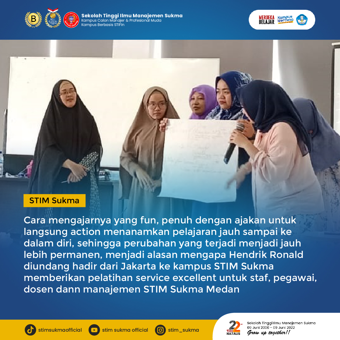 Cara mengajarnya yang fun, penuh dengan ajakan untuk langsung action menanamkan pelajaran jauh sampai ke dalam diri, sehingga perubahan yang terjadi menjadi jauh lebih permanen, menjadi alasan mengapa Hendrik Ronald diundang hadir dari Jakarta ke kampus STIM Sukma memberikan pelatihan service excellent untuk staf pegawai, dosen dann manajemen STIM Sukma Medan.