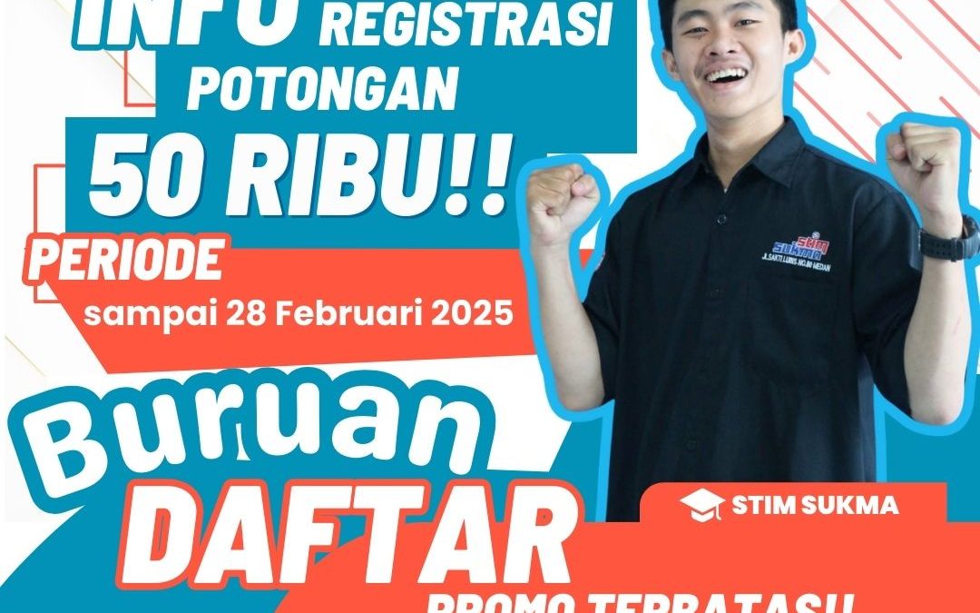 Hei, calon mahasiswa kece! Masih ragu buat daftar kuliah? Jangan tunggu sampai kesempatan ini lewat! STIM Sukma kasih POTONGAN REGISTRASI 50K buat kamu yang daftar sekarang! 💰✨