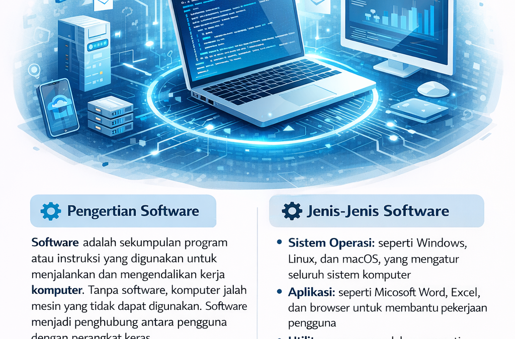 Di era digital saat ini, komputer tidak dapat berfungsi tanpa adanya software (perangkat lunak). Software berperan sebagai “otak” yang mengatur dan mengendalikan seluruh aktivitas komputer, sehingga perangkat keras dapat bekerja dengan optimal.