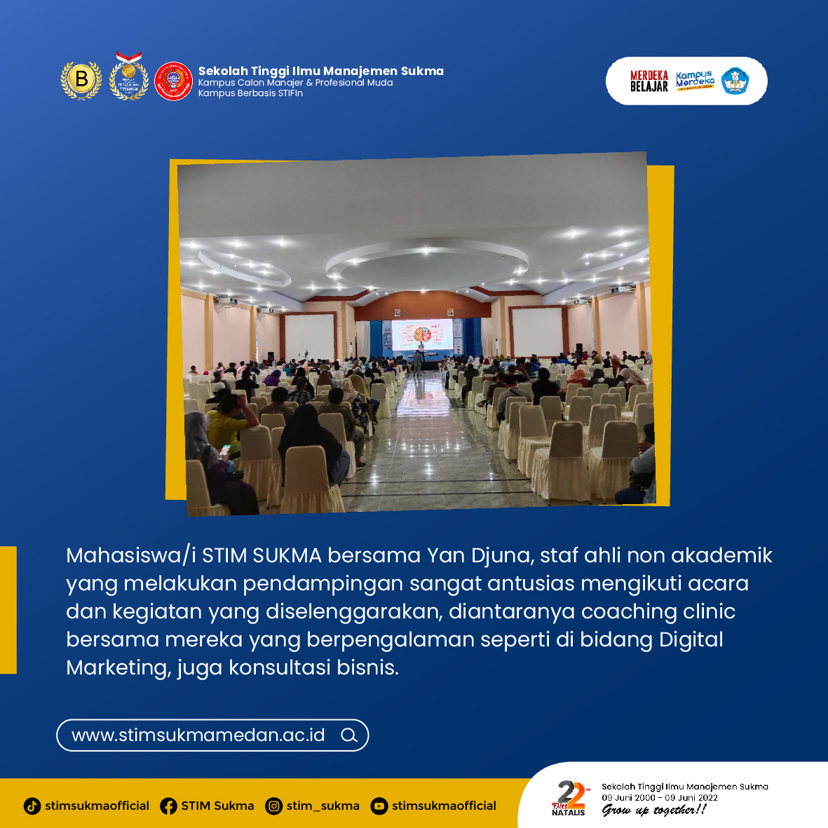 Mahasiswa/i STIM SUKMA bersama Yan Djuna, staf ahli non akademik yang melakukan pendampingan sangat antusias mengikuti acara dan kegiatan yang diselenggarakan, diantaranya coaching clinic bersama mereka yang berpengalaman seperti di bidang Digital Marketing, juga konsultasi bisnis.