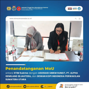 Telah terlaksana penandatanganan Memorandum of Understanding (MoU) antara STIM Sukma dengan ASOSIASI UMKM SUMUT, PT. ALPHA GEMILANG SEJAHTERA, dan DEWAN KOPI INDONESIA PERWAKILAN SUMATERA UTARA pada Selasa, 7 Februari 2023.