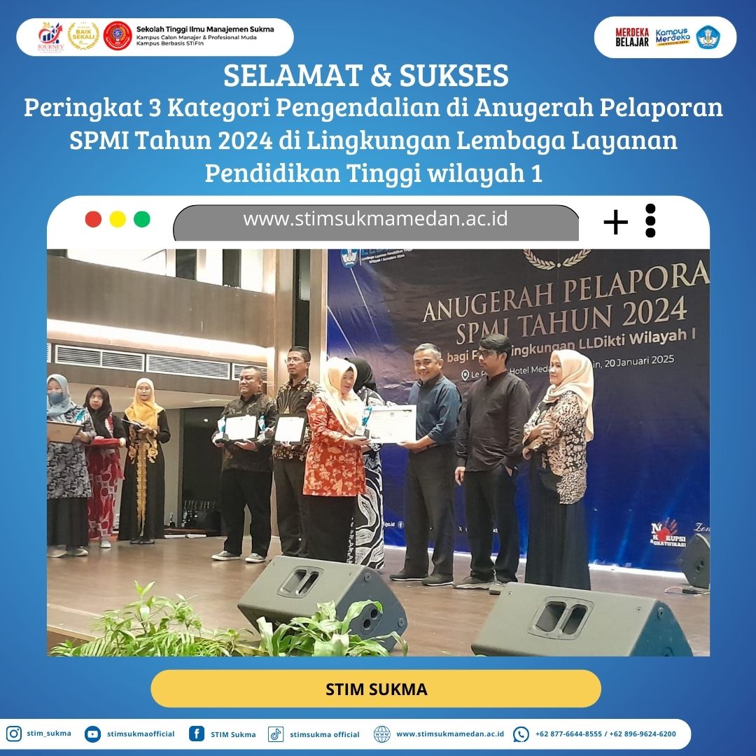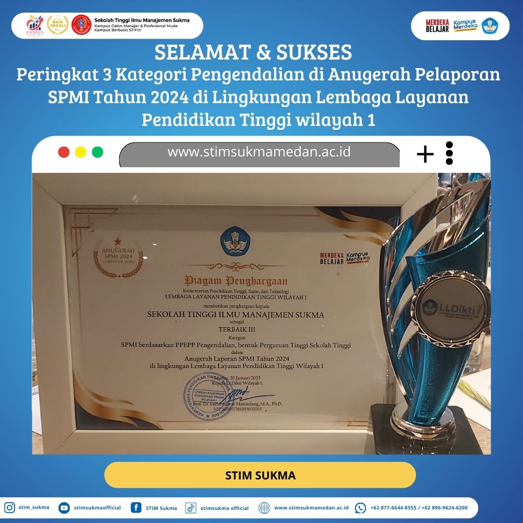 Sekolah Tinggi Ilmu Manajemen (STIM) Sukma berhasil meraih Peringkat 3 Kategori Pengendalian dalam Anugerah Pelaporan SPMI Tahun 2024 🏆 di lingkungan Lembaga Layanan Pendidikan Tinggi Wilayah 1!