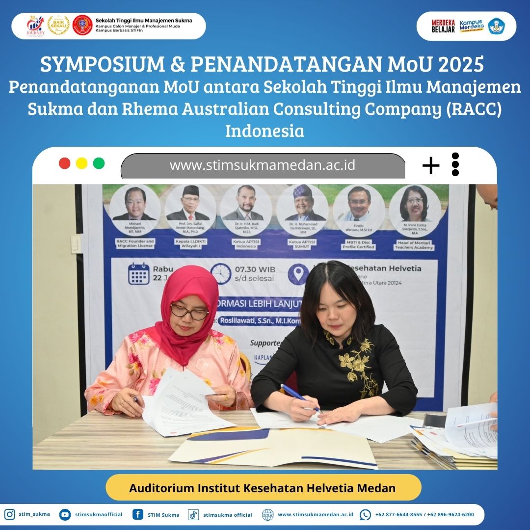📚 Symposium: Sinergi Perguruan Tinggi Swasta Sebagai Pilar Transformasi Pendidikan Global & Penandatanganan MoU antara Sekolah Tinggi Ilmu Manajemen Sukma dan Rhema Australian Consulting Company (RACC) Indonesia 🇮🇩, langsung ditandatangani oleh Ketua STIM Sukma, Ibu Dr. Wardayani, SE, M.Si.